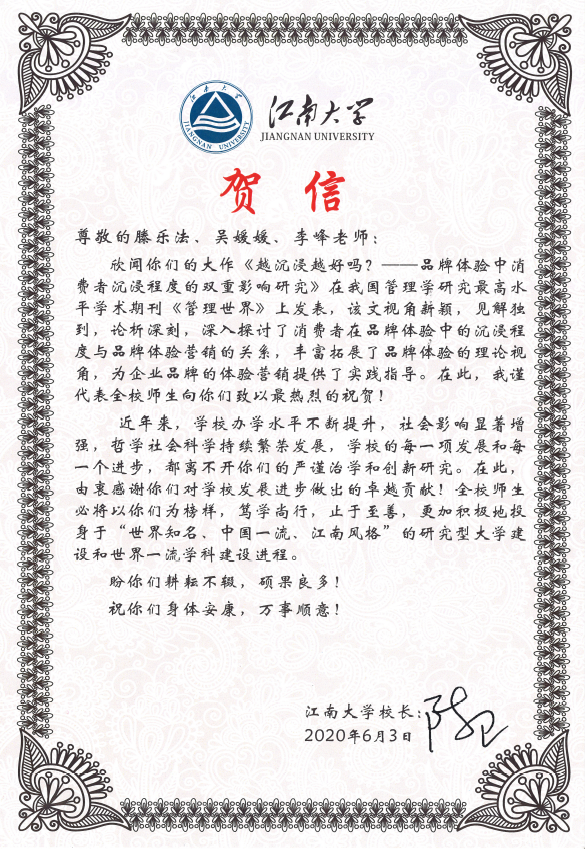 欣闻你们的大作《越沉浸越好吗?——品牌体验中消费者沉浸程度的双重影响研究》在我国管理学研究最高水平学术期刊《管理世界》上发表,该文视角新颖,见 解独到,论析深刻,深入探讨了消费者在品牌体验中的沉浸程度与品牌体验营销的关系。丰富拓展了品牌体验的理论视角,为企业品牌的体验营销提供了实践指导。在此,我谨代表全校师生向你们致以最热烈的祝贺!