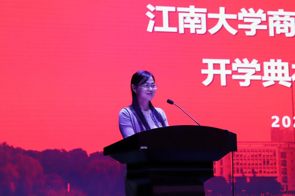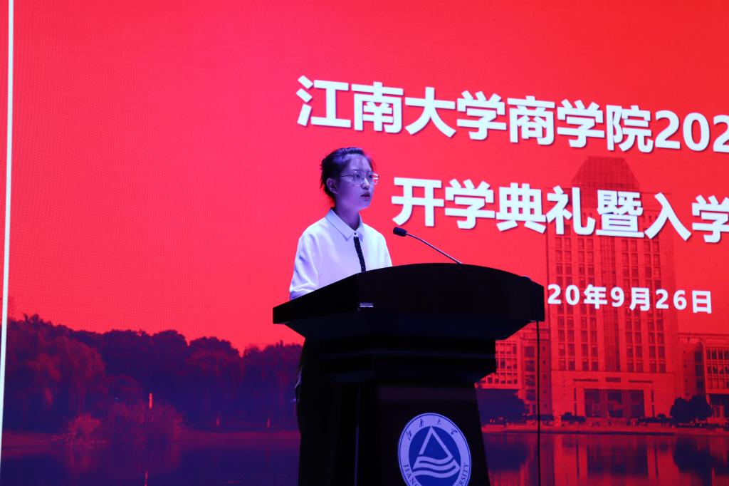 2020级会计三班张雅柔作为新生代表上台发言。毕业于衡水第一中学、曾获国家级荣誉,张雅柔展示了商院新人的决心与担当,讲述了习惯对于大学生活的重要性,希望每位同学都让努力、实践和优秀成为始终伴随自己的好习惯。