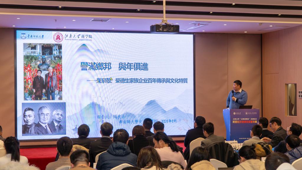 在主题分享环节,华南师范大学历史文化学院硕士生导师,中山大学(管理学院)中国家族企业研究中心研究员周孜正博士带来以“誉满乡邦 与年俱进—荣宗敬、荣德生家族企业百年传承与文化特质”为主题的研究分享。周博士从荣宗敬先生的家族成人片、荣宗敬和荣鸿庆先生家族成人片传承的方式及硕果,荣德生和荣毅仁先生家族成人片传承的方式及硕果等三个维度切入,分析荣氏家族何以实现家族代代传承、家业百年长青。