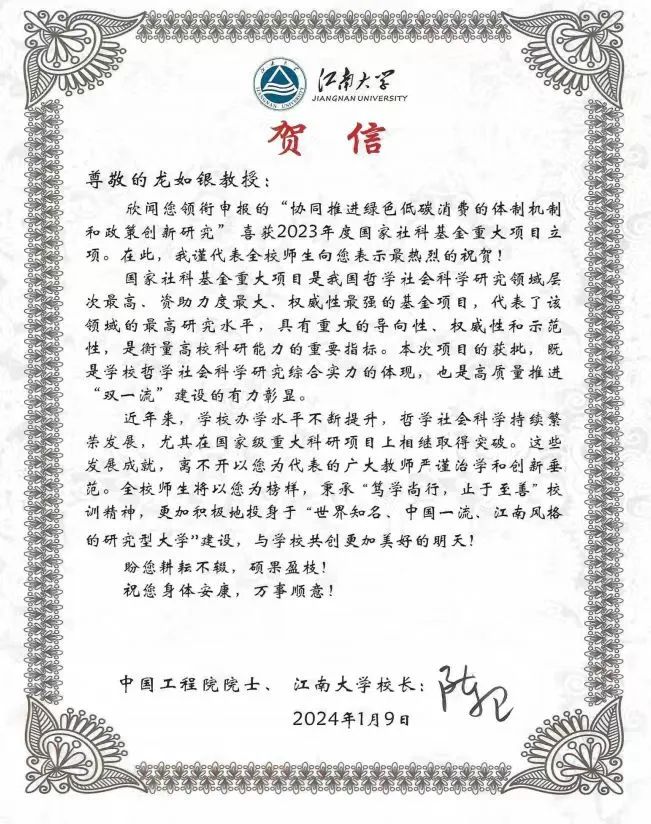 欣闻您领衔申报的“协同推进绿色低碳消费的体制机制和政策创新研究”喜获2023年度国家社科基金重大项目立项。在此,我谨代表全校师生向您表示最热烈的祝贺!