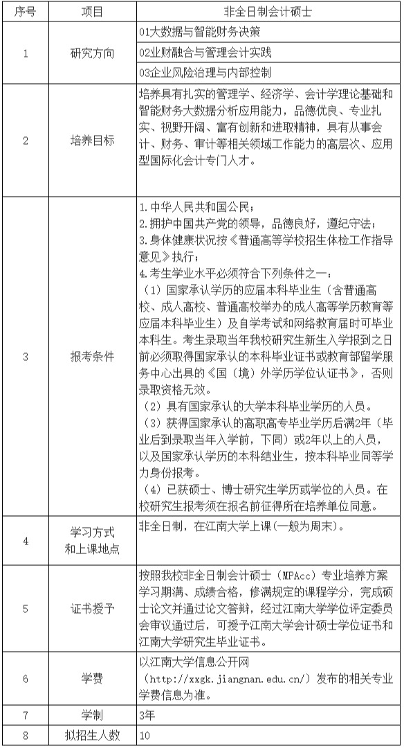 (一)我校非全日制会计硕士(MPAcc)专业不招收“单独考试”考生,无“退役大学生士兵计划”和“少数民族高层次骨干人才”计划。