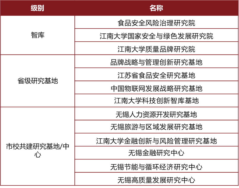 学院建有5个省级科研平台,与地方政府共建6个跨学科研究中心, 食品安全风险治理研究院入选中国高校智库百强(全国前25强,江苏仅2家)并获评A+;入选中国智库索引(CTTI)来源智库;2018年省重点培育智库年度考核中获“优秀”(全省3家),并获入选CTTI2022年度高校智库百强榜;中国物联网发展战略基地2019年入选中国智库索引(CTTI)来源智库。