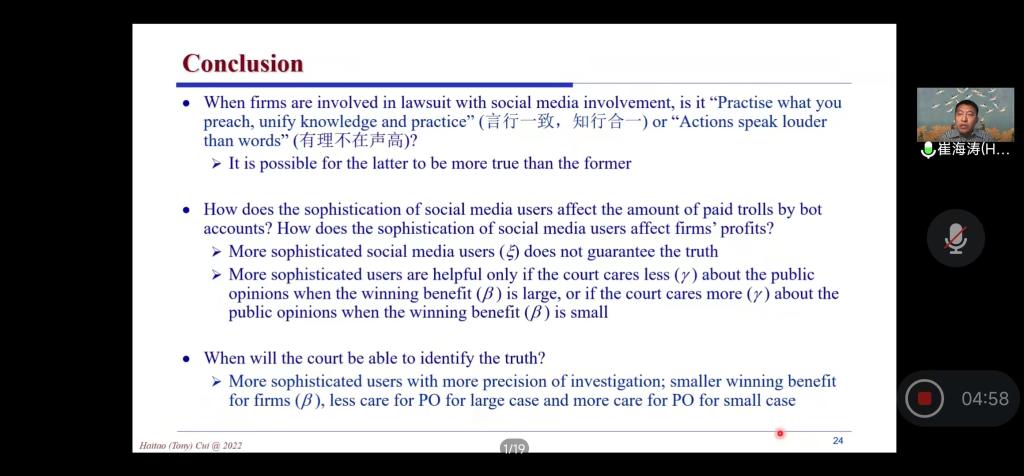 随后,崔教授介绍了模型的构建过程。模型将真实用户分为有主见和无主见两类,并考虑有主见用户调查案件真相的准确性、无主见用户对纠纷双方的支持率以及企业雇佣“水军”的成本等因素,并提出“法庭不仅关注真相,还关注社会舆论”等研究假设。进而阐述了纠纷双方的博弈过程和分离均衡,分析法庭识别真相的条件、有主见用户的比例与调查概率对“水军”数量和企业盈利的影响等问题,并分享了本研究的重要结论——当纠纷为小案件时,法庭越关注公众舆论,越容易发现真相;相反,当纠纷为大案件时,社会舆论水平越高,越可能埋没真相。