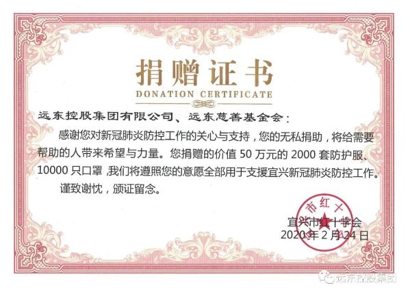 远东控股集团&远东慈善基金会向宜兴市卫健委捐赠价值50万元的2000套防护服、10000个KN95口罩