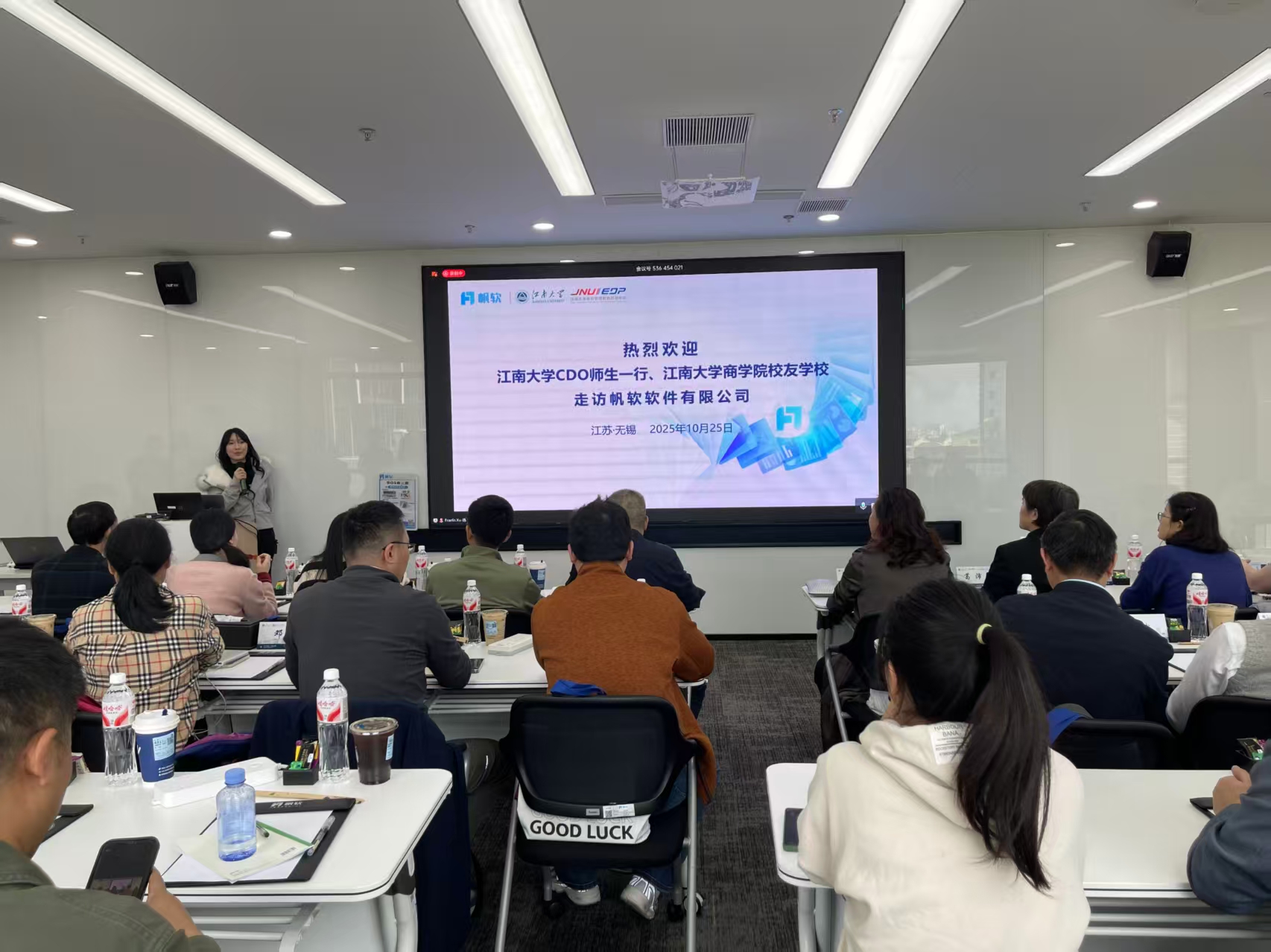 下午,“校友学校”学员赴校企合作单位——帆软软件有限公司总部开展访学活动。帆软研究数据专家张云扬就企业战略与数字化发展路径进行了深度分享。帆软CFO濮丹丹结合财务部门的信息化实践,系统介绍了如何依托简道云无代码平台,在IT支持有限的情况下,分阶段推进内部管理系统建设。