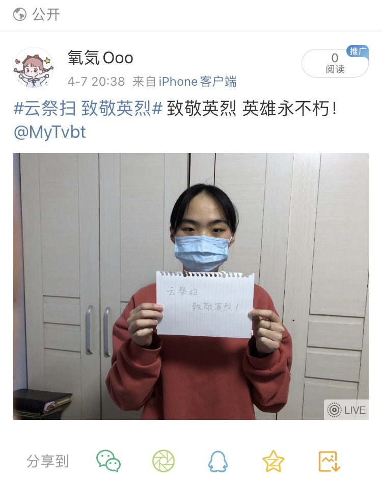 微博传递接力,缅怀致敬英烈。革命先烈的丰功伟绩铭记在心,疫情下最美逆行者的光辉事迹激励着我们前行。为致敬革命英烈和抗疫英雄,成人片 党委在微博上共同发起了#云祭扫,致敬英烈#的话题活动,号召全体学生党员通过微博表达对革命先辈和抗疫英雄的缅怀与哀思,佩戴口罩与写有“云祭扫·致敬英烈”标语合影并上传微博,圈出自己身边的同学进行接力传递。截至4月8日最新,该话题已达到3.8万的阅读量,商院学生党员真正做到在“学思践悟”中不忘初心、牢记使命,身体力行地带动着身边更多的青年学子传承和弘扬革命精神。