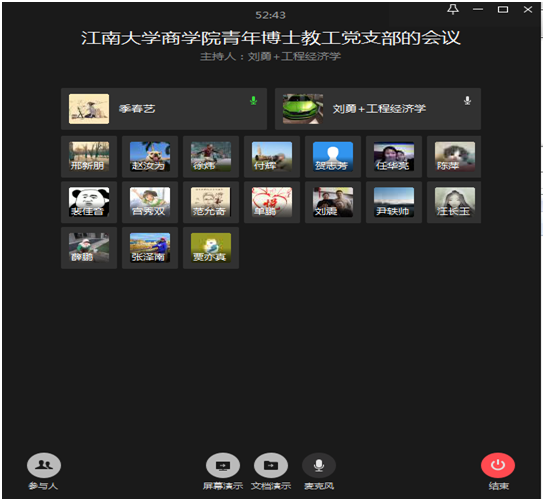 3月18日下午,青年博士教工支部21名党员以“不忘初心、协同育人有担当”为主题,召开“线上”组织生活会,围绕疫情期间如何保持共产党员先进性、如何高效开展在线教学与课题申报等进行学习交流,会议由支部书记刘勇主持。