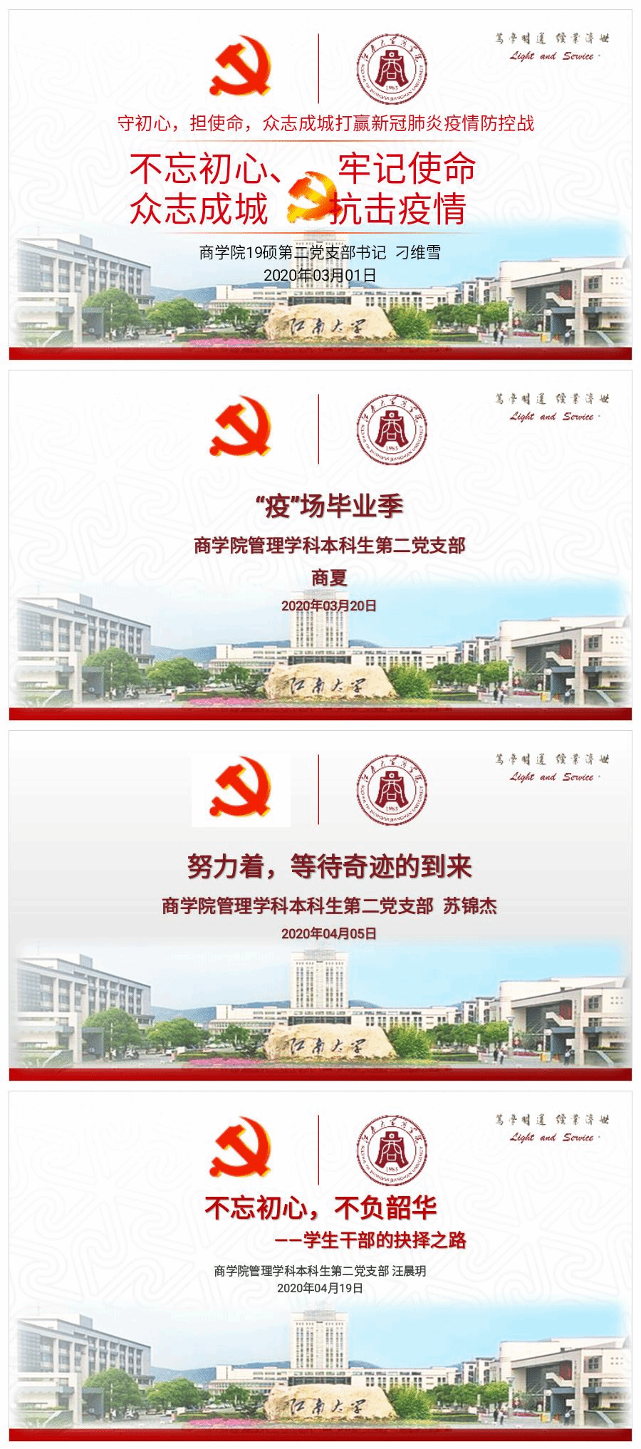 策划组织优秀学生党员面向发展对象、入党积极分子举办了共计四期战“疫”专题“我来上微党课”活动,分别是:余莉攀、刁维雪、董雅《疫情期间,青年党员的责任与担当》,号召党员战“疫”勇担使命;王欣冉、张天悦、商夏《疫情之下,毕业生的前路》,揭示当前就业机遇与挑战;苏锦杰、布玉婷、韦雅丽《实习深造立担当,青春逐梦正当时》,助力提升人才培养质量;汪晨玥、李王新、魏清健《传承朋辈精神,秉持独立理念》,筑牢党员党性修养。本次战“疫”系列专题“我来讲微党课”,有利于助推发展对象及入党积极分子在学习中修己正心,以全新面貌迎接疫情后的大学求知成长路。