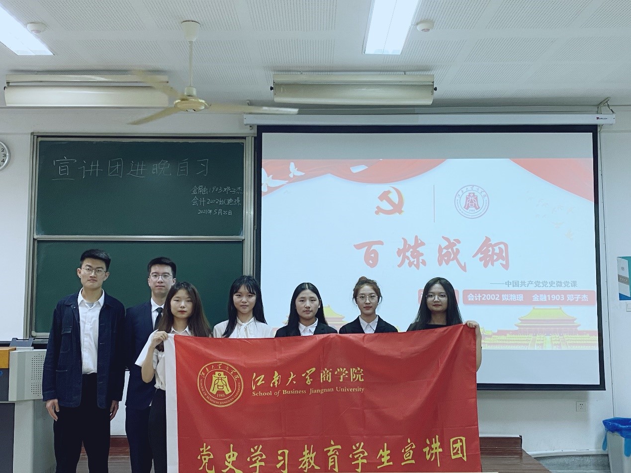聘请优秀研究生党员、团支书、学生党建中心成员组建党史学习教育学生宣讲团,由学习培训到实践宣讲,开展了一系列党史学习教育。本次党史宣讲团采取输入输出相结合的方式,通过无锡市关工委报告团成员姚炳华老先生讲党课、理论知识学习、党建馆参观感悟等学习活动进行党史知识输入,借助入党积极分子培训、党史宣讲团进晚自习等契机进行党史知识宣讲输出,学育并举,扎实开展好党史知识学习与宣传教育,将中国共产党的百年光辉奋斗史在学生中广泛传播宣讲,让更多的学生以坚定的信念积极向党组织靠拢。