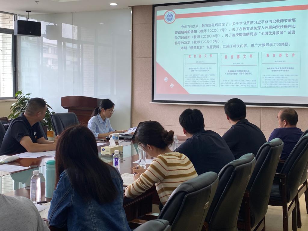 徐静副书记传达校党委宣传部、教师工作部“关于转发《教育部关于学习贯彻习近平总书记教师节重要寄语精神的通知》的通知”精神,并领学“悟习近平教师节重要寄语精神,学陶德麟张桂梅先进典型事迹”师德专题学习内容。