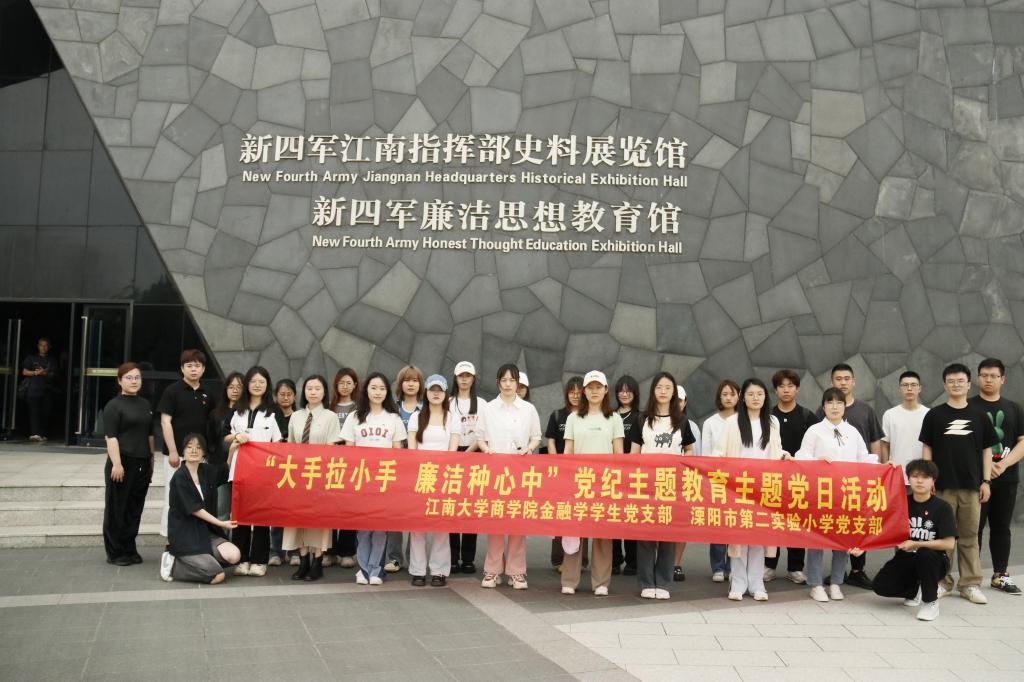 为深入学习贯彻习近平新时代中国特色社会主义思想和党的二十大精神,加快构建“党建引领、资源共享、优势互补、协调发展”的基层党建工作新格局,扎实推进党纪学习教育走深走实,5月22日下午,成人片 金融学学生党支部与溧阳市第二实验小学党支部在新四军廉洁教育纪念馆和溧阳市第二实验小学开展“大手拉小手,廉洁种心中”结对共建签约活动。溧阳市第二实验小学党支部书记兼校长蔡雪飞、副书记兼副校长朱永康、纪检委员兼副校长吕加良、组织委员兼副校长黄秀妹、副校长吴薇、成人片 分团委书记兼学工办主任王璁、成人片 金融学学生党支部书记吴松与两支部全体同志30余人参加活动。活动由溧阳市第二实验小学党支部宣传委员张晓主持。