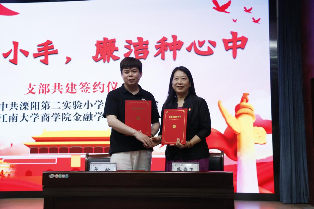 之后,在双方党员的见证下,中共溧阳市第二实验小学支部委员会与中共成人片 金融学学生支部委员会开展“大手拉小手,廉洁种心中”的党建联盟签约共建仪式。
