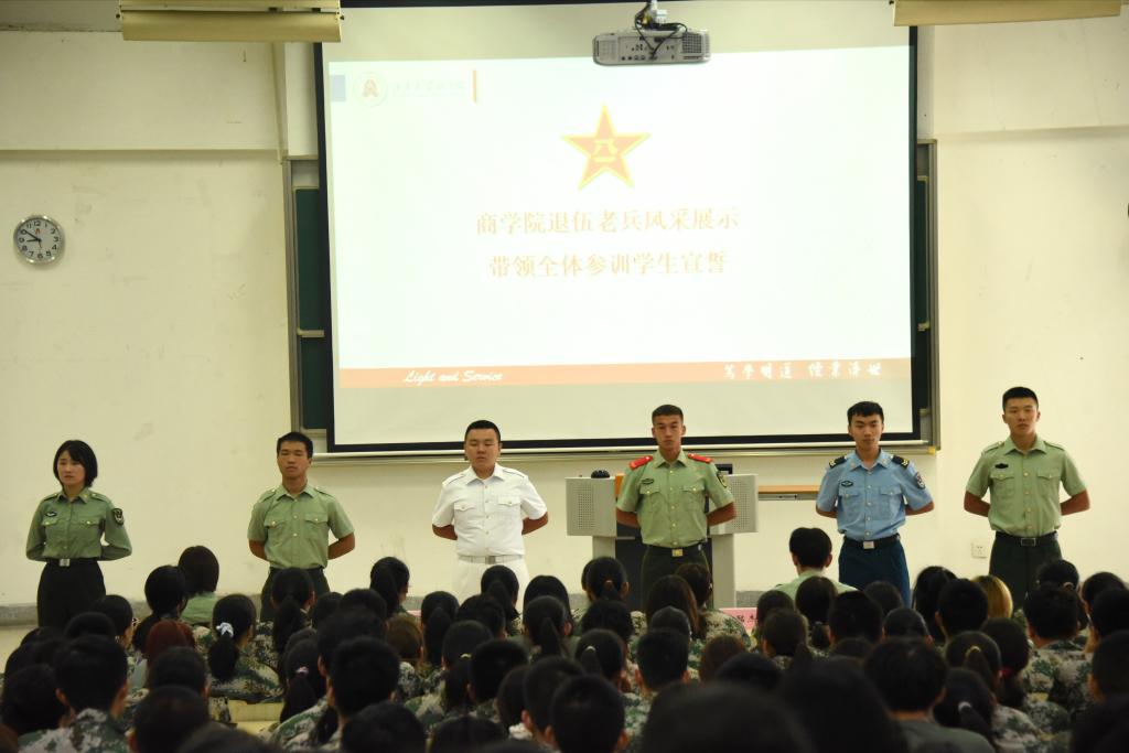 学院6名退伍老兵孟根宝力格、张猛绮、鲁统旗、陈赟、刘梦君、克依萨尔江为现场同学带来了精彩展示,老兵们的飒爽英姿赢得了大家的热烈掌声。优秀老兵代表鲁统旗介绍了他的军营生活并带领全体参训学生庄严宣誓。他希望同学们能够学会服从与合作,在心里种下热爱祖国的种子。