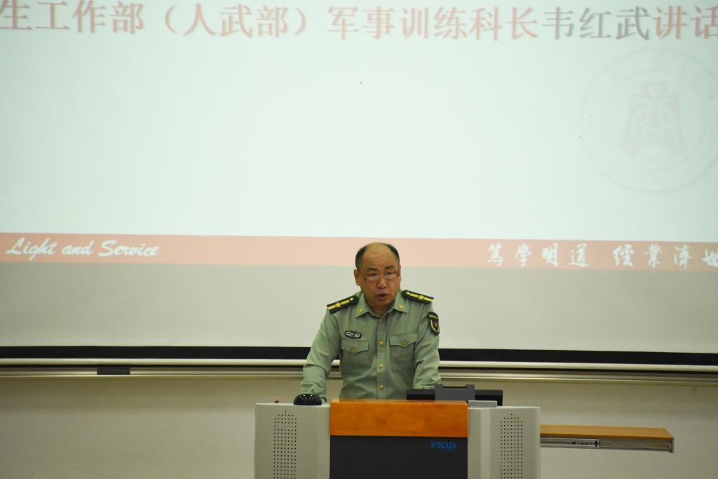 校学生工作部(人武部)军事训练科科长韦红武为全体参训人员作动员讲话。他表示,军训的目的是通过严格的军事训练提高学生的思想政治觉悟,使学生能够增强身体素质并发扬艰苦奋斗、吃苦耐劳的精神,同时让新生们充分认识到军事训练的重要意义,提高生活积极性和组织纪律性。韦科长还表示,希望在疫情防控的特殊背景下,同学们能够切实做好安全防护,保障自身安全。
