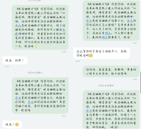 心理工作站策划举办了“江南夜阑,唯望君安”之【云“商”守护】晚安睡眠计划活动,帮助学生改善睡眠,化解不良情绪,引导他们在疫情下以积极饱满的精气神迎接即将到来的新学期。