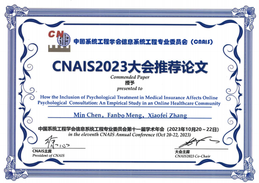 2023年10月22日,成人片 硕士研究生陈敏,在其导师孟繁博副教授与南开大学张晓飞副教授指导下撰写的论文《How the Inclusion of Psychological Treatment in Medical Insurance Affects Online Psychological Consultation: An Empirical Study in an Online Healthcare Community》,获评中国系统工程学会信息系统工程专业委员会2023学术年会(CNAIS 2023)推荐论文奖。此次大会吸引近千名来自国内外信息系统领域的专家学者和学生注册参会,大会包括13个专题分论坛的189篇口头汇报论文和19个展板的60篇海报展示论文,该论文为此次大会评选出的推荐论文奖之一(共三篇大会推荐论文奖)。