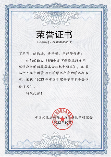 丁军飞副教授撰写的论文《EPR制度下新能源汽车闭环供应链的回收成本分担机制研究》获评第二十五届中国管理科学学术年会推荐论文奖。此次大会邀请了中国工程院院士杨善林、陈晓红、唐立新等知名专家,吸引了国内管理科学领域的专家学者和学生1300余人,设置了8场大会特邀报告、4场论坛和围绕9个专题的18个平行分专题会场进行学术交流研讨,该论文为此次年会评选出的推荐论文奖之一。