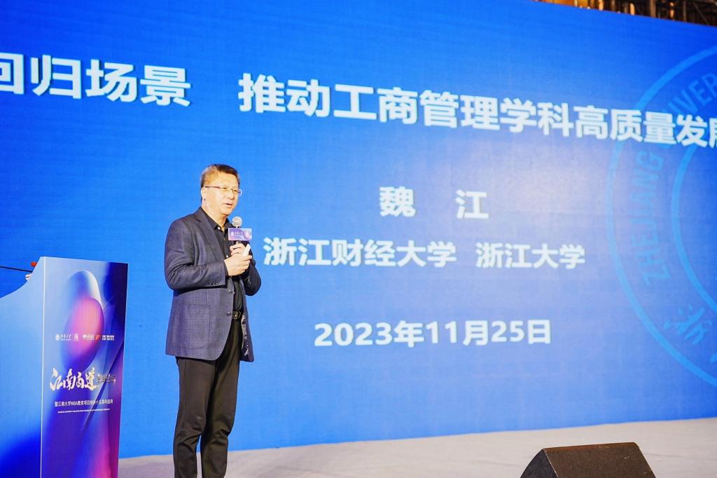 在论坛交流中,浙江财经大学副书记、副校长(主持工作)魏江以《“商学+教育生态系统”促进成人片 的高质量发展》为题作了主旨演讲。