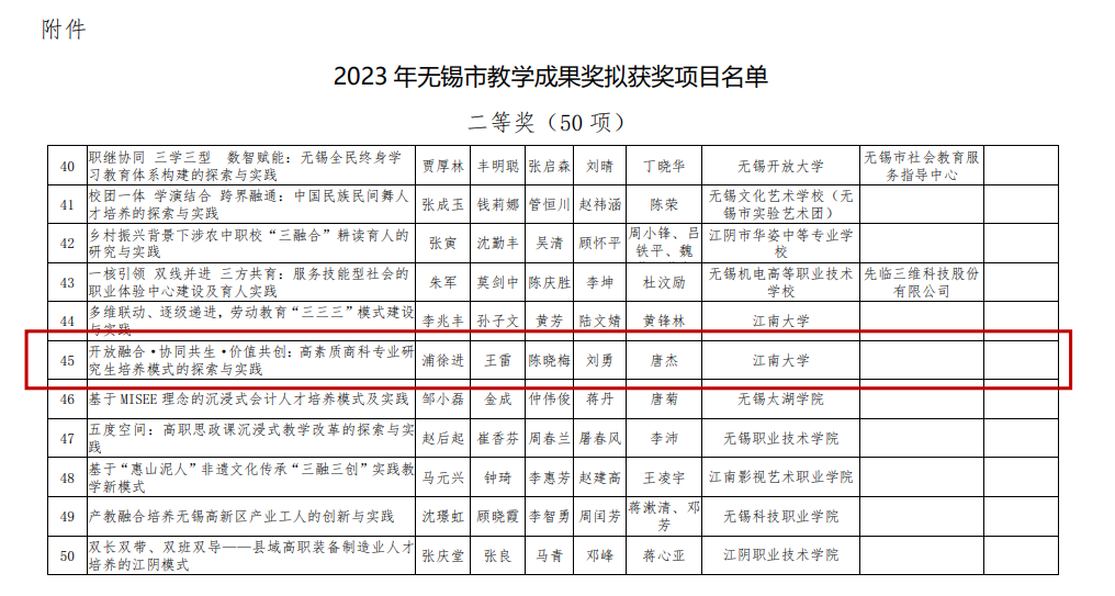 申报的“开放融合·协同共生·价值共创:高素质商科专业研究生培养模式的探索与实践”获得无锡市教学成果二等奖。