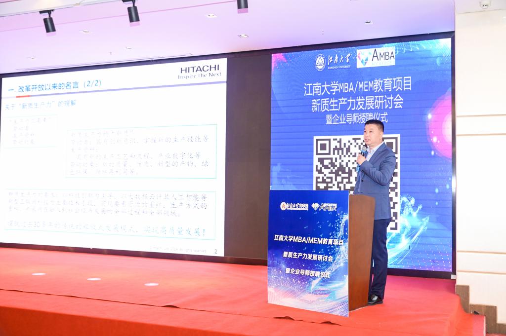 2022级企业导师代表日立泵制造(无锡)有限公司总经理马永红应邀做了题为《关于新质生产力的浅见》的分享,马总引用企业实际案例对比分析了新质生产力背景下企业在实践中的创新,对改革创新生产关系、形成新的管理模式和体制机制进行了深入解读。