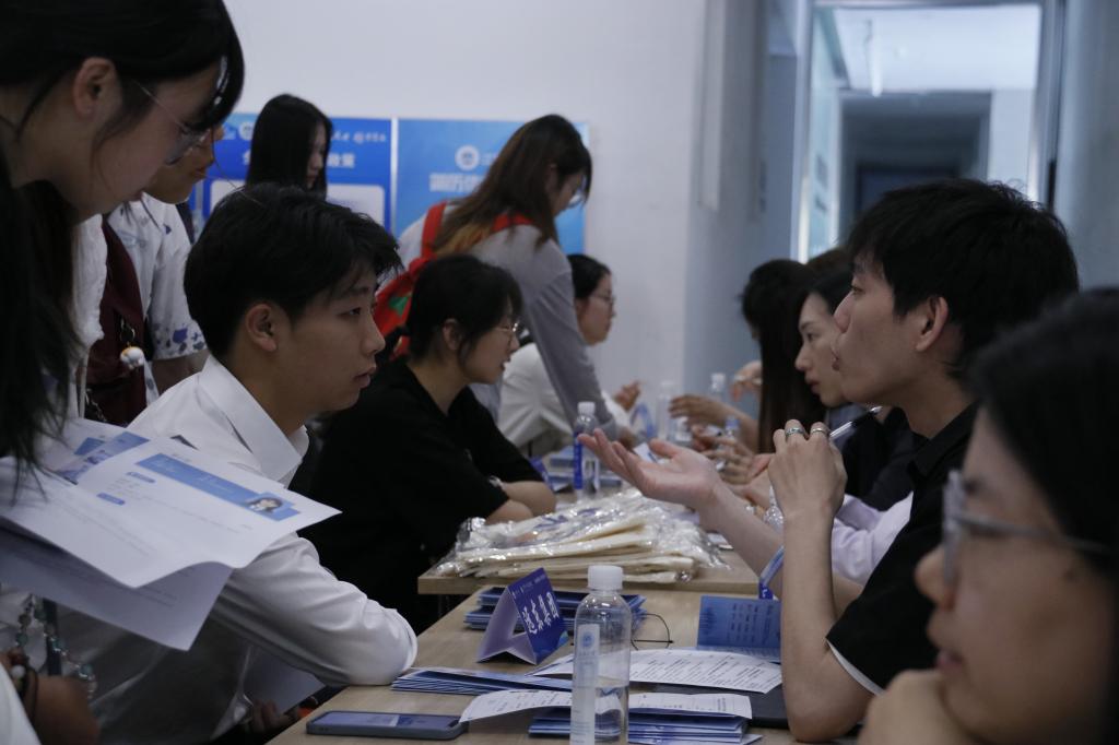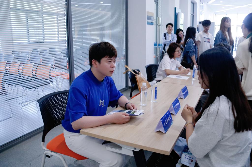 全部本硕专业,为学生们现场提供了百余个实习岗位,吸引了150余位在校学生参加。招聘会现场气氛热烈,秩序井然。同学们携带简历穿梭于各展位前,结合自身规划目标和就业需求,主动积极与意向单位交谈,以期挑选到自己心仪的岗位。企业代表们耐心答疑解问,循循善诱猎英才。