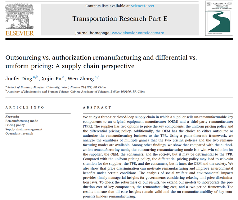 丁军飞副教授、浦徐进教授和张文副教授共同完成的论文“Outsourcing vs. authorization remanufacturing and differential vs. uniform pricing: A supply chain perspective”。