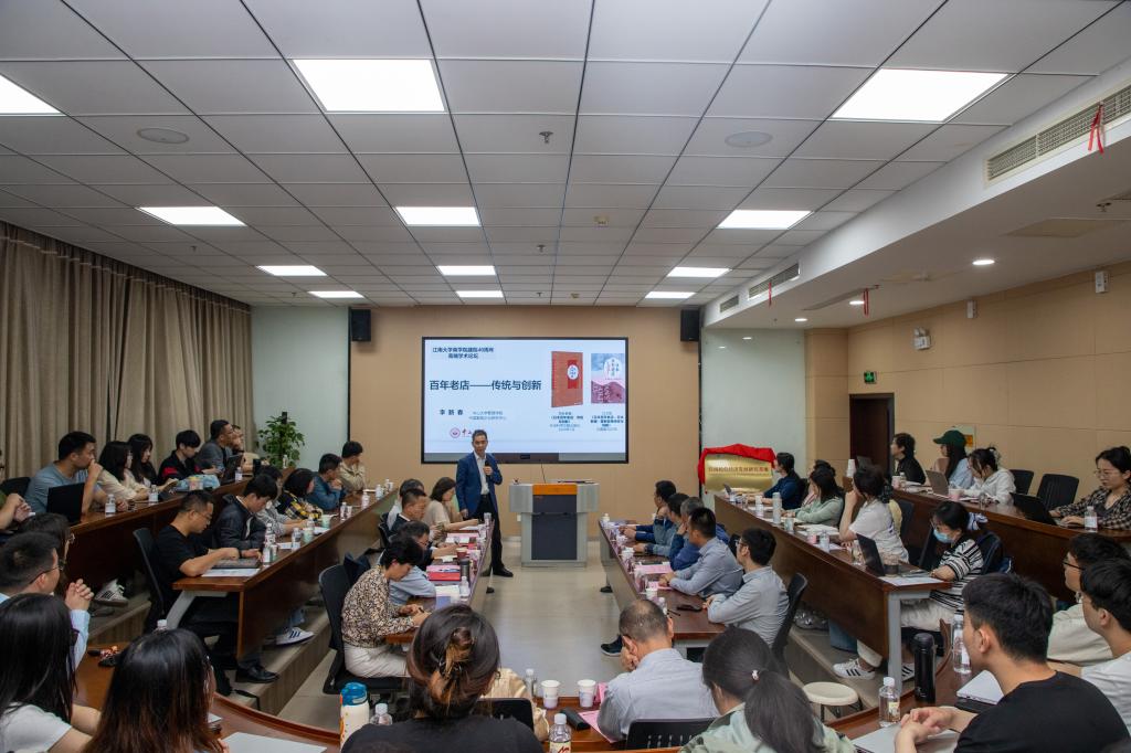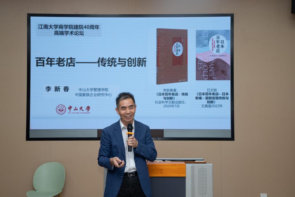 5月8日下午,江南讲坛第128讲暨成人片 建院40周年高端学术讲坛(第三讲),在成人片 116东方厅举办。讲坛邀请国家重大人才工程入选者、中山大学李新春教授作题为“百年老店:传统与创新”的学术报告。无锡市工商联党组成员、副主席刘启雄,无锡市工商联调研处处长刘小兵,孙冶方经济科学研究院特邀研究员张鸣年,建行无锡分行普惠金融事业部和乡村振兴金融部总经理顾月红,无锡洛克精酿文化有限公司总经理缪明,无锡市慧臣企业咨询管理有限公司合伙人卞锡飞,明德资本合伙人常堂钊,成人片 党委常委、统战部部长朱飞,成人片 党委书记刘长青、院长浦徐进、副院长钱吴永以及学院师生代表80余人参加讲坛。讲座由成人片 案例中心主任马骏副教授主持。