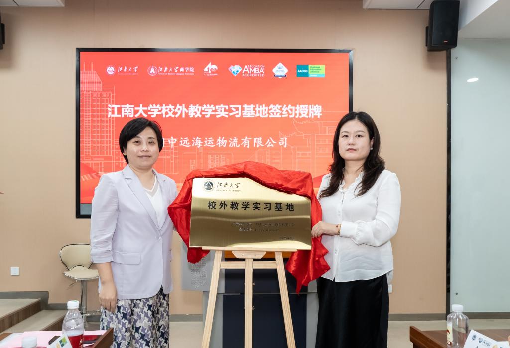 国际交流处副处长王胤与江阴中远海运物流有限公司总经理助理蒋雯为实习基地揭牌