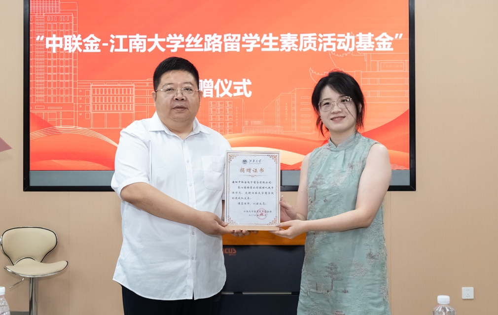 丝路留学生素质活动基金”,专项支持丝路留学生素质提升活动项目。刘长青向中联金集团无锡不锈钢电子交易有限公司市场总监贝拉女士颁发捐赠证书。