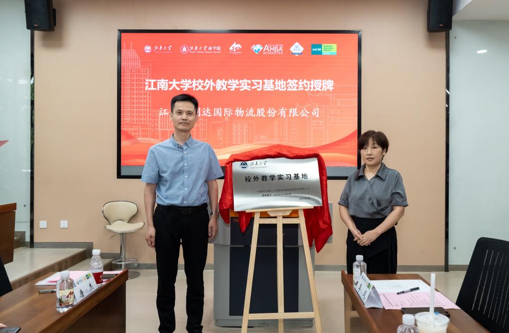 研究生工作部副部长陈周与江苏佳利达国际物流股份有限公司李凤经理为实习基地揭牌