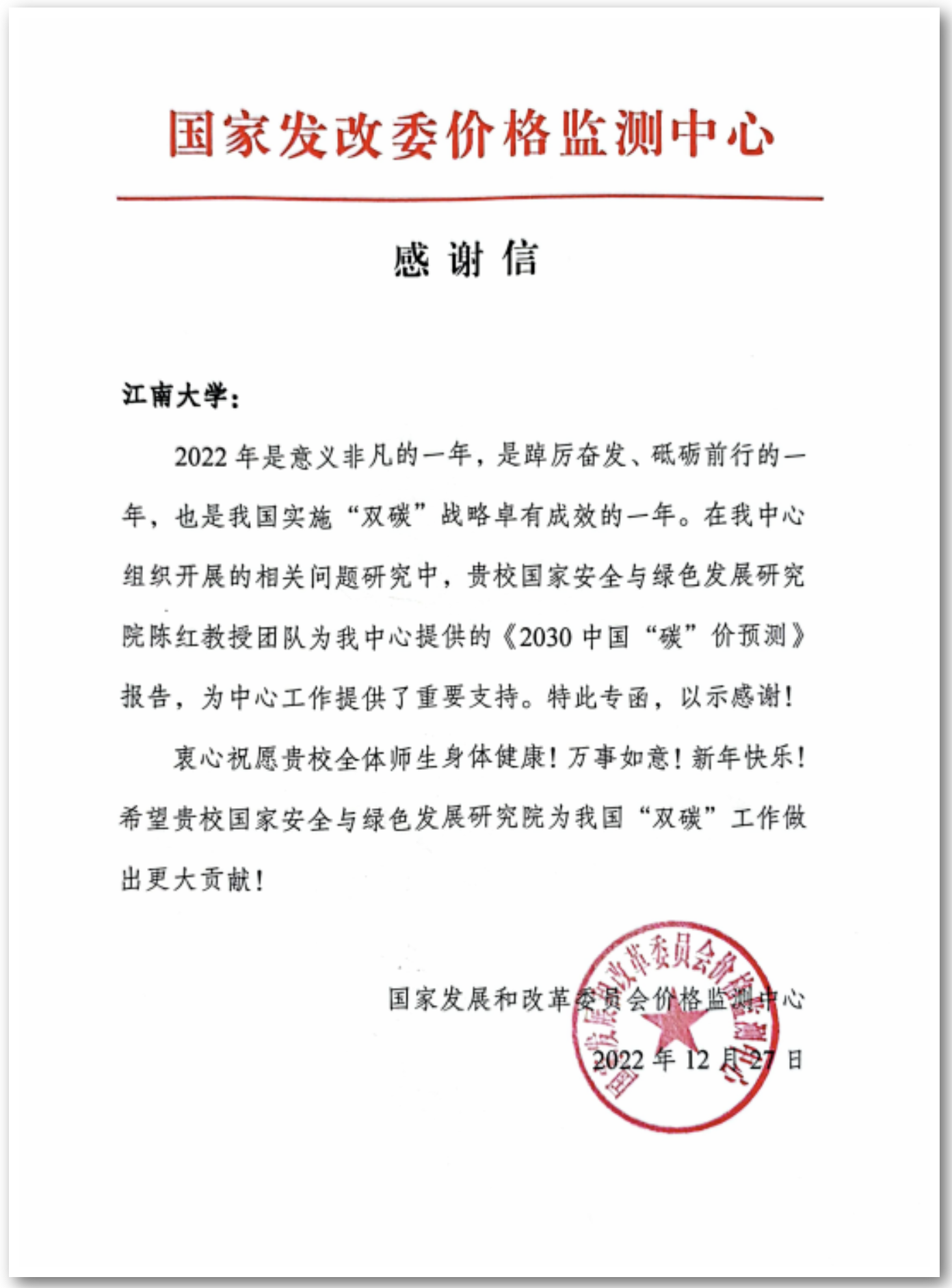 2022年6月17日,成人片 国家安全与绿色发展研究院接到国家发改委价格监测中心商请协助做好碳交易价格研究支持的函,研究院随即组织专班开展专项研究,并于2022年8月6日将《2030中国“碳”价预测》报告提交给国家发改委价格监测中心。2022年12月27日,国家发改委价格监测中心给成人片 致专函感谢成人片 国家安全与绿色发展研究院团队《2030中国“碳”价预测》报告为中心工作提供的重要支持。