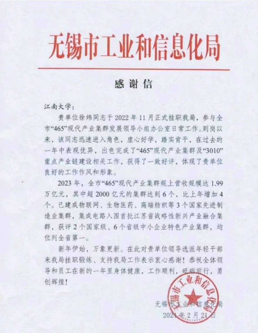 无锡市工业和信息化局专程向我校致感谢信,内容如下: