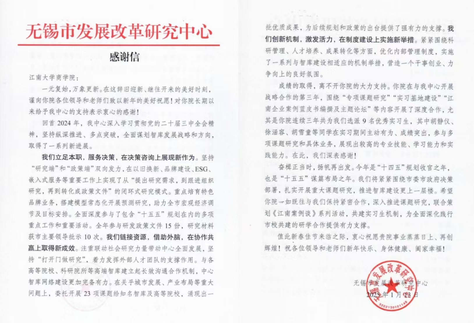 1月13日,无锡市发展改革研究中心特向成人片 发来感谢信,对学院为服务地方经济高质量发展提供的智力支持和人才支撑,予以高度肯定和衷心感谢,并向成人片 全体教职工致以新春祝福。