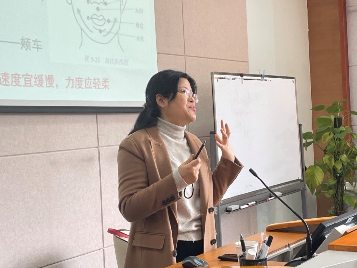丁敏主任按照针灸概述、穴位按摩、刮痧概述与刮痧操作的脉络展开讲解。首先,丁敏主任介绍了针灸疗法的理念内涵,指出针灸可以通过经络系统的感传和作用来治疗人体疾病,其具有疏通经络、调和阴阳与祛正祛邪的作用。她将经络系统的基本组成等医疗基础知识以通俗易懂的方式向与会老师作了生动的讲解,丰富了各位老师对中医保健的认知。