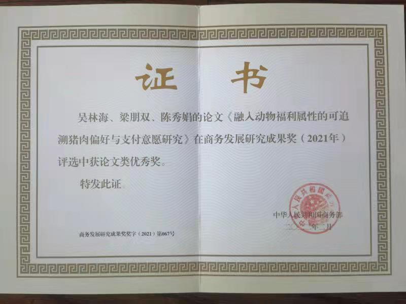 在商务发展研究成果奖项方面传来佳讯。浦徐进教授的专著《供应链模式创新:线上线下融合之路》获得国家商务部商务发展研究成果奖(2021)论著类二等奖;吴林海教授的论文“融入动物福利属性的可追溯猪肉偏好与支付意愿研究”获论文类优秀奖