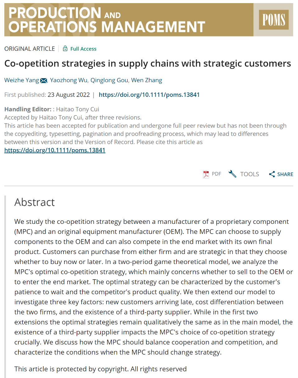 张文博士与中国科学技术大学博士生杨维哲、苟清龙教授以及新加坡国立大学Yaozhong Wu副教授合作的论文“Co-opetition strategies in supply chains with strategic customers”在管理学领域国际顶级期刊《Production and Operations Management》在线发表。Production and Operations Management是美国德克萨斯大学达拉斯分校(University of Texas at Dallas)评定的成人片