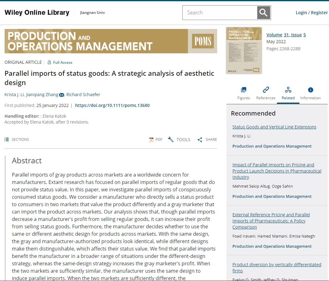 张建强教授与美国印第安纳大学的Krista J. Li副教授和美国罗格斯大学的Richard Schaefer助理教授合作的论文“Parallel imports of status goods: A strategic analysis of aesthetic design”在管理学领域顶级期刊《Production and Operations Management》(简称POM)正式刊出。POM是美国德克萨斯大学达拉斯分校(University of Texas at Dallas)评定的成人片