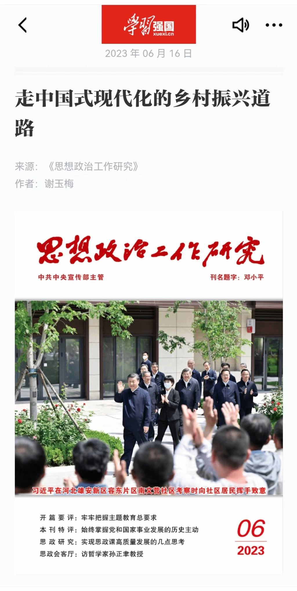 学习强国客户端转载《走中国式现代化的乡村振兴道路》