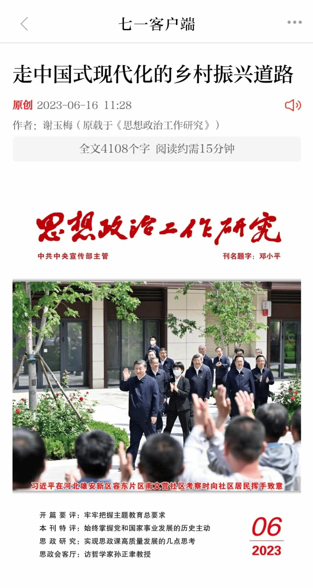 七一客户端转载《走中国式现代化的乡村振兴道路》