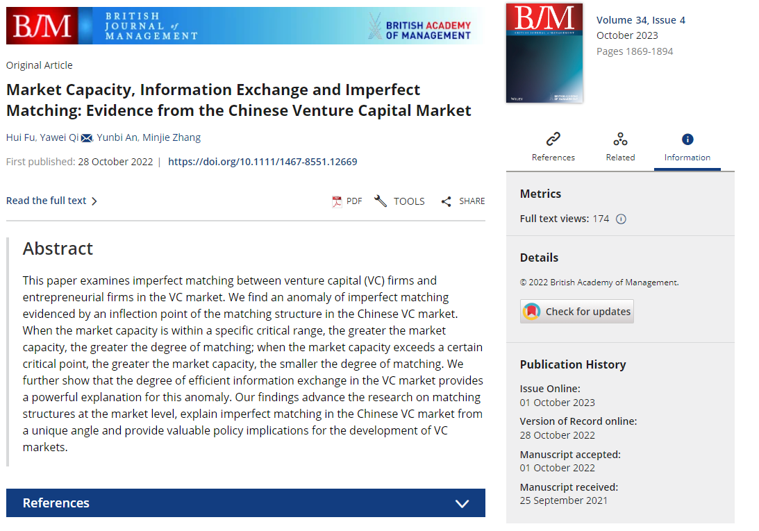 付辉副教授作为第一作者与合作者共同完成的论文“Market Capacity, Information Exchange and Imperfect Matching: Evidence from the Chinese Venture Capital Market”(市场容量、信息交换与不完美匹配:来自中国风险投资市场的证据)。