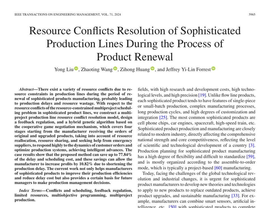近日,成人片 刘勇教授团队在工程管理领域重要期刊《IEEE Transactions on Engineering Management》发表题为“Resource Conflicts Resolution of Sophisticated Production Lines During the Process of Product Renewal”的研究论文。