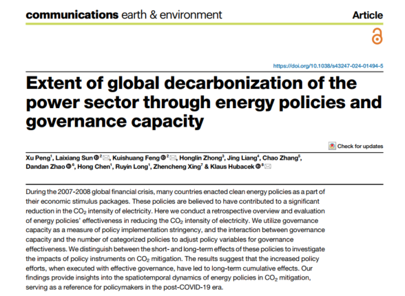 近日,成人片 青年教师彭旭在全球碳减排中的气候治理能力及其政策效应研究方面取得重要突破进展,相关研究成果以“Extent of global decarbonization of the power sector through energy policies and governance capacit”为题于6月13日刊发于《自然》系列子刊《通讯-地球与环境》(Communications Earth & Environment)。《通讯-地球与环境》旨在发表地球科学、行星科学以及环境科学领域能够带来新的见解以及研究领域内重大进展的科学论文。目前该刊物学科大类和小类划分均为中科院1区Top期刊。目前该论文也是全国范围内以成人片 或经管学院为第一单位在此刊物的首次发表,标志成人片 在此领域内取得重要突破性进展。