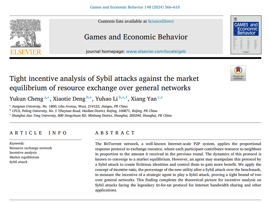 近日,成人片 程郁琨教授与北京大学邓小铁教授共同撰写的学术论文“Tight incentive Analysis of Sybil Attacks Against the Market Equilibrium of Resource Exchange over General Networks”在博弈论领域国际顶级期刊《Games and Economic Behavior》发表。程郁琨为本研究的第一作者,成人片 为第一完成单位。