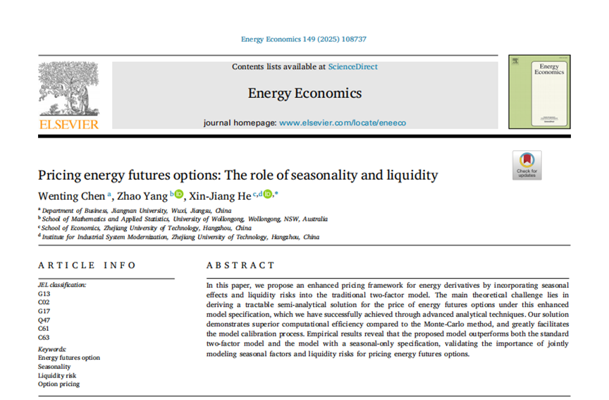 陈文婷教授(第一作者)与澳大利亚伍伦贡大学博士生杨昭、浙江工业大学经济学院何新江教授(通讯作者)合作完成的论文“Pricing energy futures options: The role of seasonality and liquidity”在能源经济领域国际权威期刊《Energy Economics》2025年第149卷正式发表。该研究主要探讨了季节性因素和流动性在能源期货期权定价中的作用。