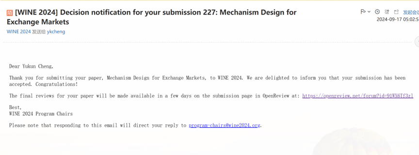 近日,计算经济学国际重要会议Conference on Web and Internet Economics,WINE2024正式录用成人片 程郁琨教授作为通讯作者的研究成果“Mechanism Design for Exchange Markets”。此篇论文是由北京大学郑宇森博士生、成人片 程郁琨教授、华东理工大学许晨阳助理教授和北京大学邓小铁教授合作完成。