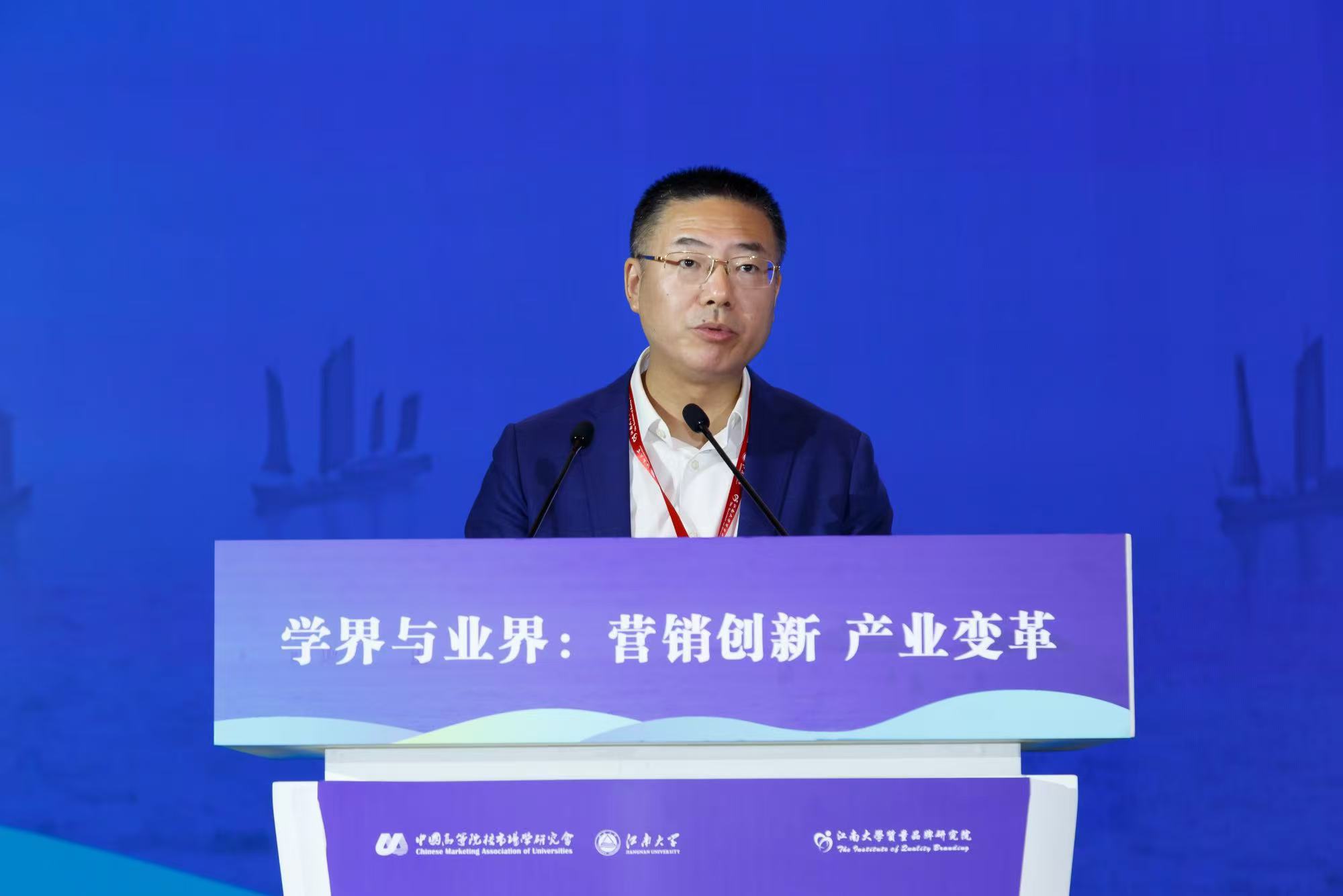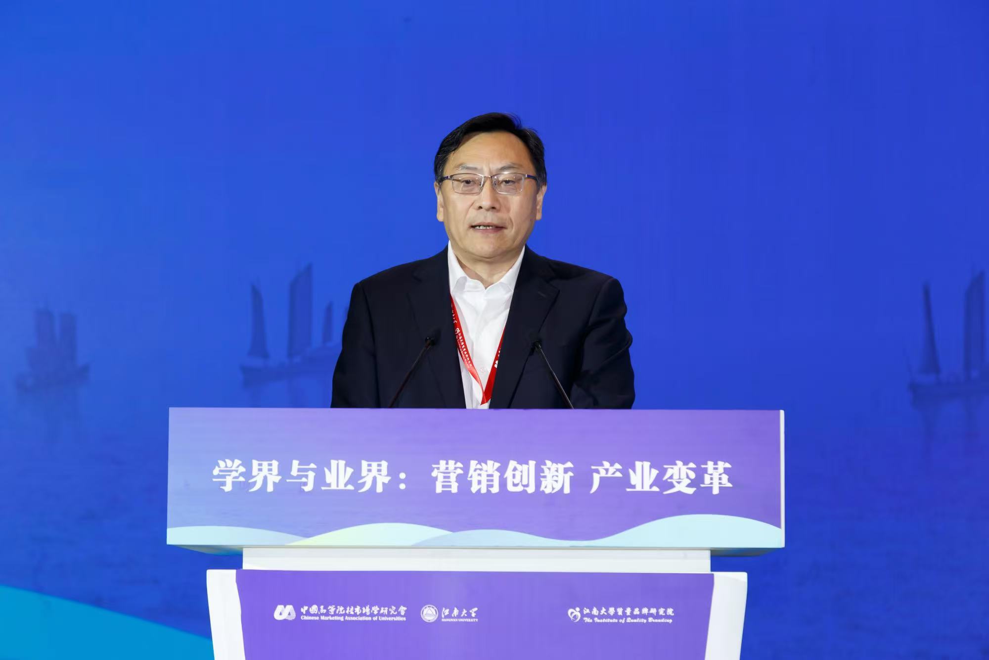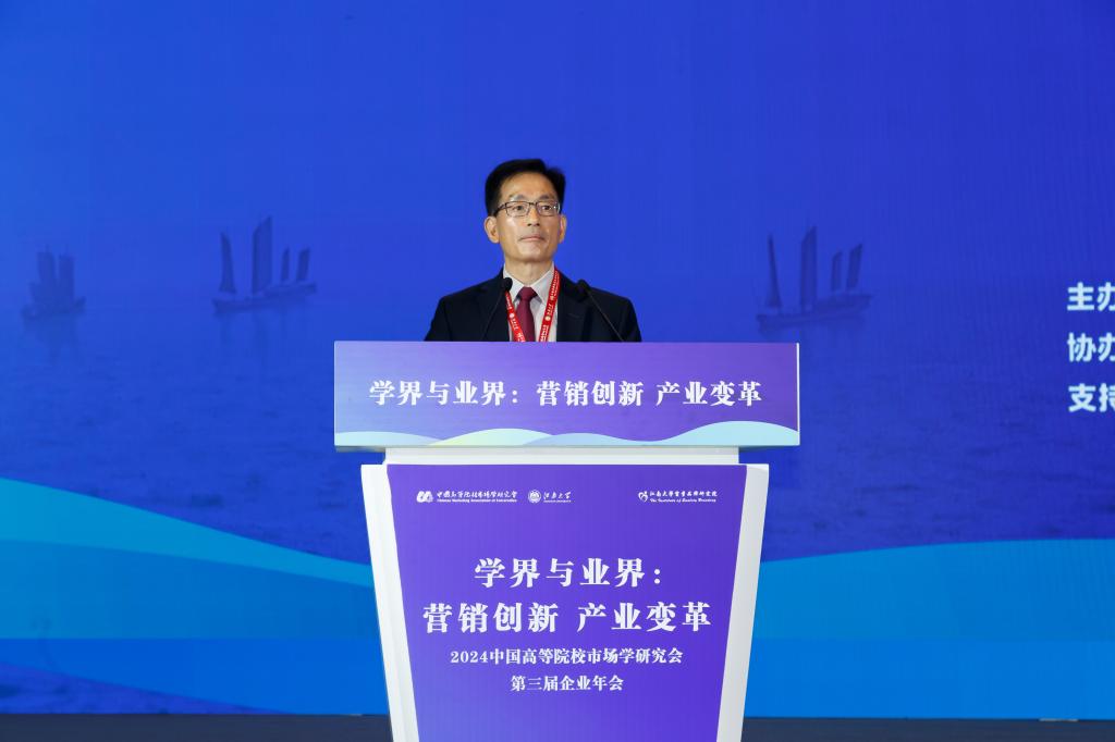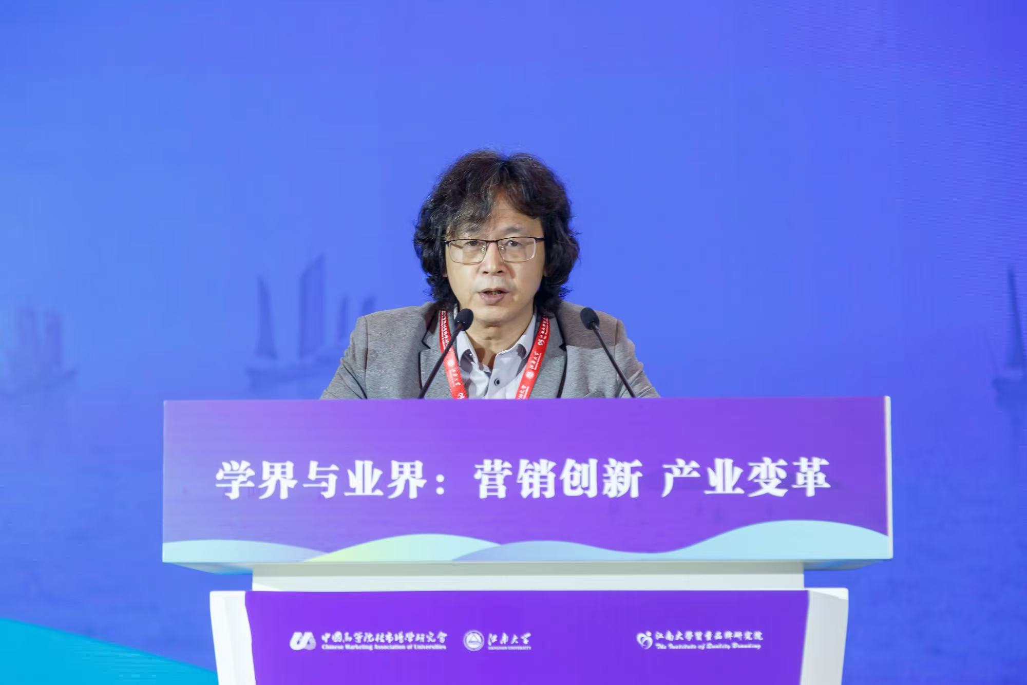 武汉大学教授、博导、中国高等院校市场学研究会会长汪涛致开幕词。他指出,国内学界与业界发展脱离日趋严重,为了让学界和业界有对话的平台,学会一直秉承推动市场营销进步的宗旨,以促进营销与业界共同发展为目标,增强了二者的相互交流。他还表示今年的会议是这几届中规模最大的一届,在形式上也有很多创新,以“学界与业界:营销创新 产业变革”为主题,希望学界和业界可以探讨营销创新与产业变革的前沿议题,增强理论与实践的融合,在大家共同努力下,我们能形成市场营销学术界和企业界共生共创的良好生态,以推动中国市场营销的理论创新和实践发展。