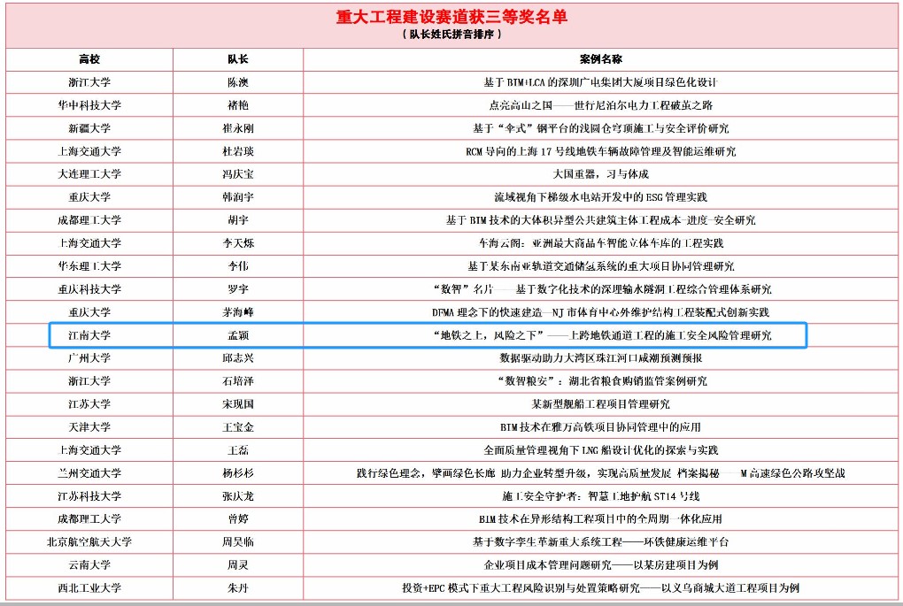 江南轨通智行队(指导老师:浦徐进、周亦宁;团队成员:何知、张国腾、孟颖、安楠、范进龙)凭借案例《“地铁之上,风险之下”——上跨地铁通道工程的施工安全风险管理研究》荣获重大工程建设赛道全国三等奖,展现了江南学子在工程管理领域的优秀才华和创新能力。