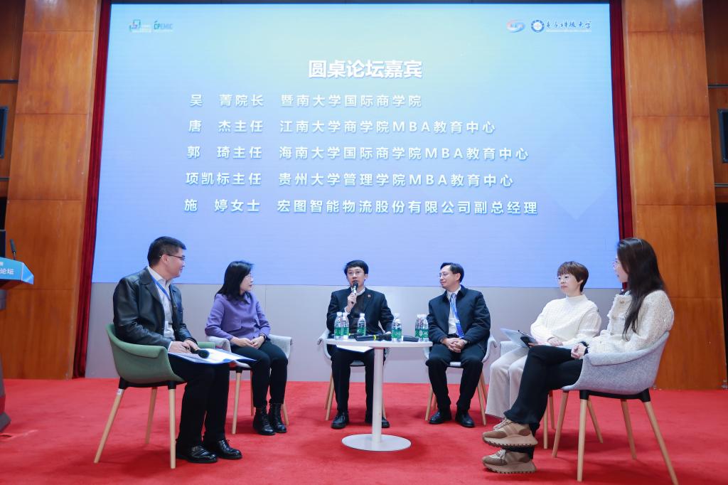 总决赛期间主办方举行了第一届研究生管理实践创新能力发展论坛,以管工交叉、产教融合助力研究生管理实践创新能力发展为主题,共同探讨数智化时代背景下研究生管理实践创新能力的培养与创新发展之路。我校MBA/MEM教育中心办公室主任唐杰老师受邀参加圆桌论坛,唐杰老师向与会老师们分享了我校成人片