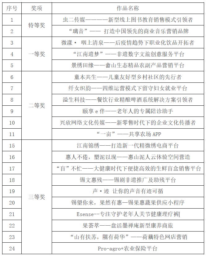 本次三创赛校内选拔赛历时四个月,共吸引了来自成人片 、食品学院、生工学院、设计学院、物联网学院等13个学院的43支团队,310名师生参与大赛,参赛作品涵盖了非遗、养老、助农、扶贫、再就业等多个主题。经过报名动员、资格审核、作品初评等,全校共11支团队进入校赛决赛环节。经过紧张激烈的角逐,来自食品学院的“虫二传媒————新型线上图书教育销售模式引领者”、环土学院的“璃音—— 打造中国领先的商业音乐营销品牌”2个项目获得特等奖;来自食品学院的“微漾· 咽上清泉——后疫情趋势下职业化饮品开拓者”等3个项目获得一等奖;来自人文学院的“童本共生——儿童友好型乡村社区的先行者”等6个项目获得二等奖;来自成人片 的“江南锦绣——打造新一代精微绣电商平台”等10个项目获得三等奖。