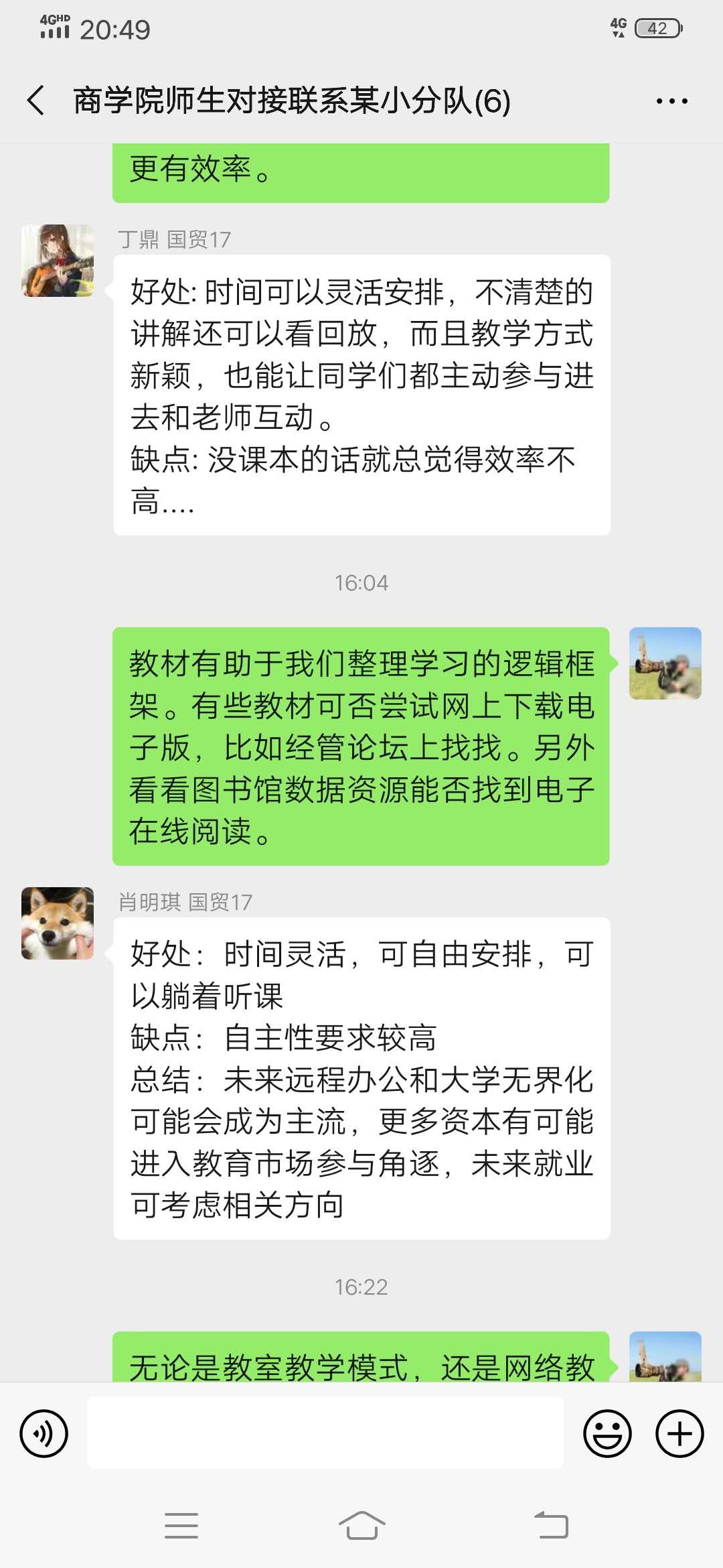 来自湖北襄阳、金融1702班的高同学说,封城之后每天待在家里非常焦虑,经常回想自己是不是和携带病毒的人有过密切接触、自己会不会感染上病毒。但很荣幸自己的对接老师是班主任徐炜老师。徐老师每天都会在微信群里关心我们以及家人的身体状况。不仅如此,老师也很关心我们的学业和心理状况,经常会和我们分享一些重大新闻,并且引导我们深入思考。让我印象最深刻的就是对于央行降息的讨论,他分析该政策从短期来看可以刺激经济发展,冲销疫情给经济发展带来的阴云。从长期来看,能很好地引导降低企业融资成本,引导银行负债成本下行,促进储蓄进入资本市场或消费,鼓励同学们养成结合国家经济发展背景下的专业思考的习惯和能力,并坚信中国有能力打赢防疫阻击战。除此之外,老师也会跟我们分享各种优质的在线学习资源。线上教学开始后,老师也教我们一些学习在线课程和慕课的方法,对我们的帮助很大。
